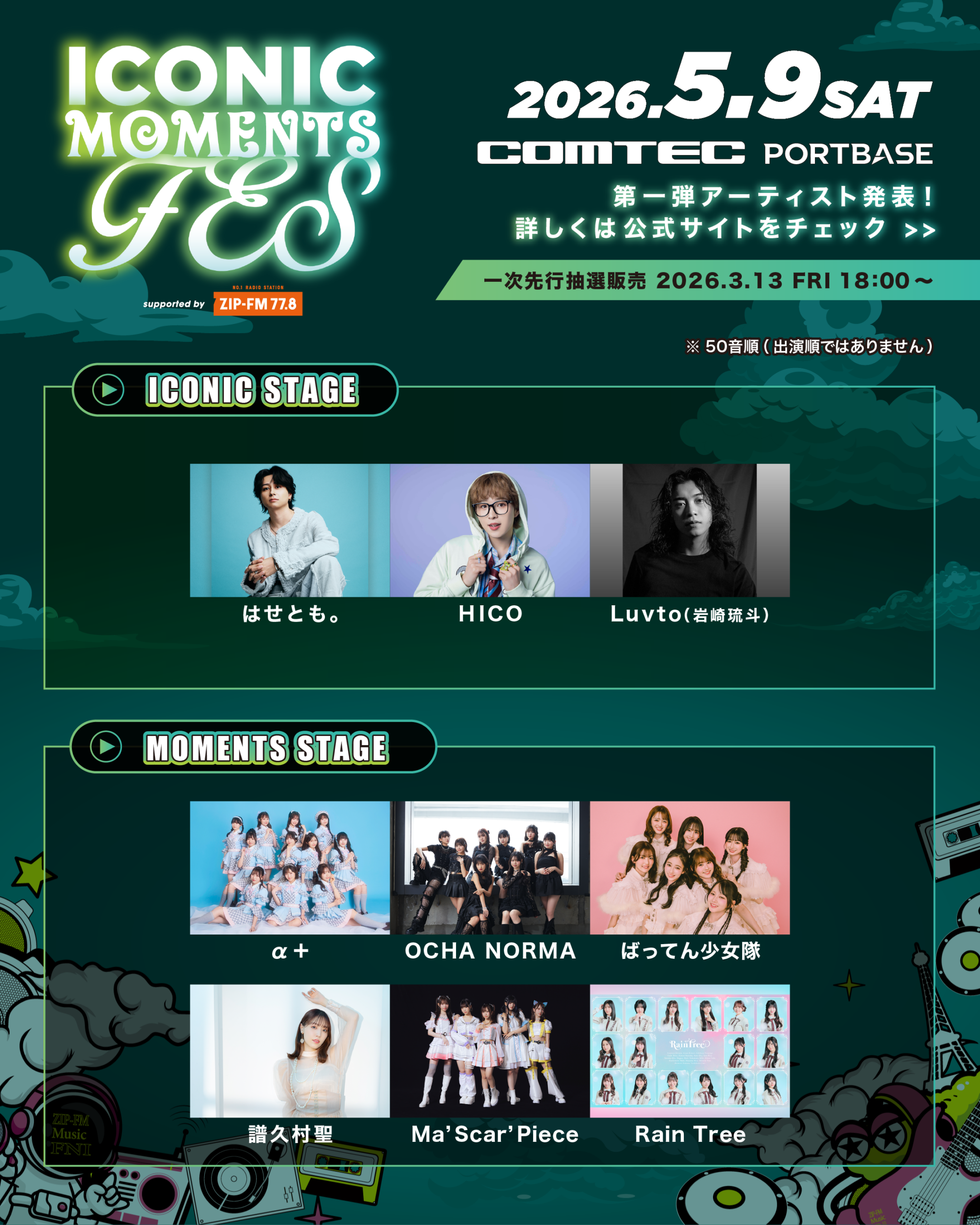 | 問合せ | ICONIC MOMENTS FES! Supported by ZIP-FM 実行委員会 |